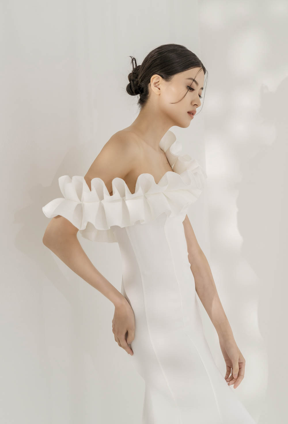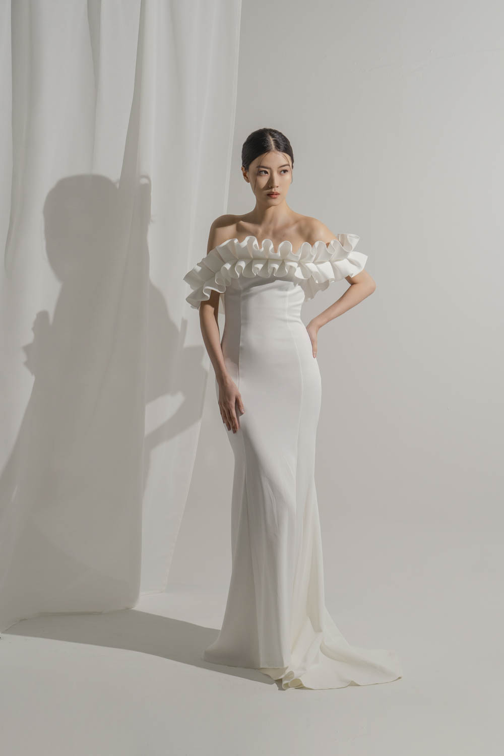 Dress Style: Off-the-shoulder trumpet gown with layered ruffle detail Silhouette: Trumpet Neckline: Off-the-shoulder with ruffle trim Fabrics: Structured crepe Waistline: Fitted, natural waist Train: Chapel-length Embellishments: Dramatic ruffle trim along neckline Special Features: Minimalist design with bold ruffle detail Color: Ivory